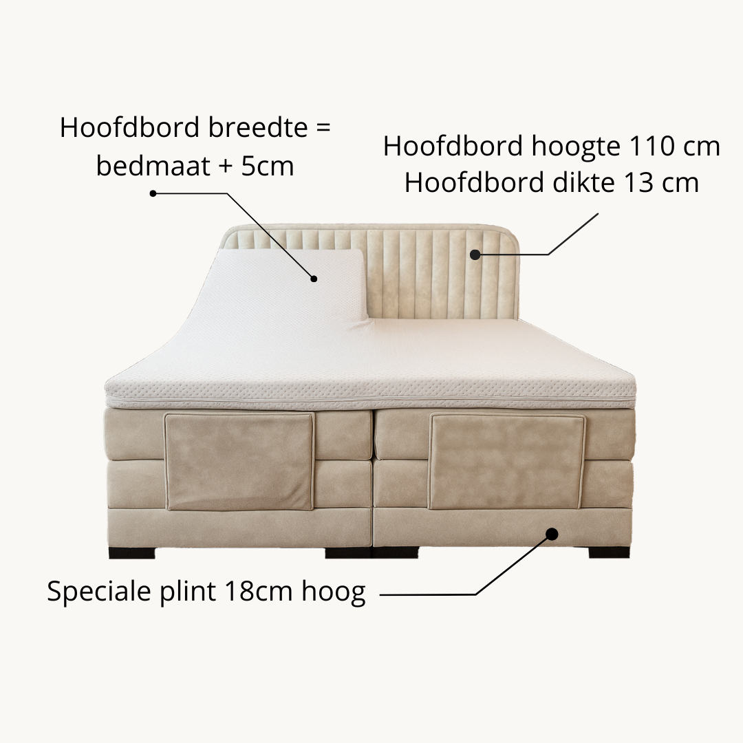 Het handgemaakte hoofdbord, bekleed met hoogwaardig velvet, geeft je slaapkamer een elegante uitstraling. De meegestoffeerde plint verbergt de motor voor een strak design, terwijl de beklede voetbeugel ervoor zorgt dat de matrassen perfect op hun plek blijven.
