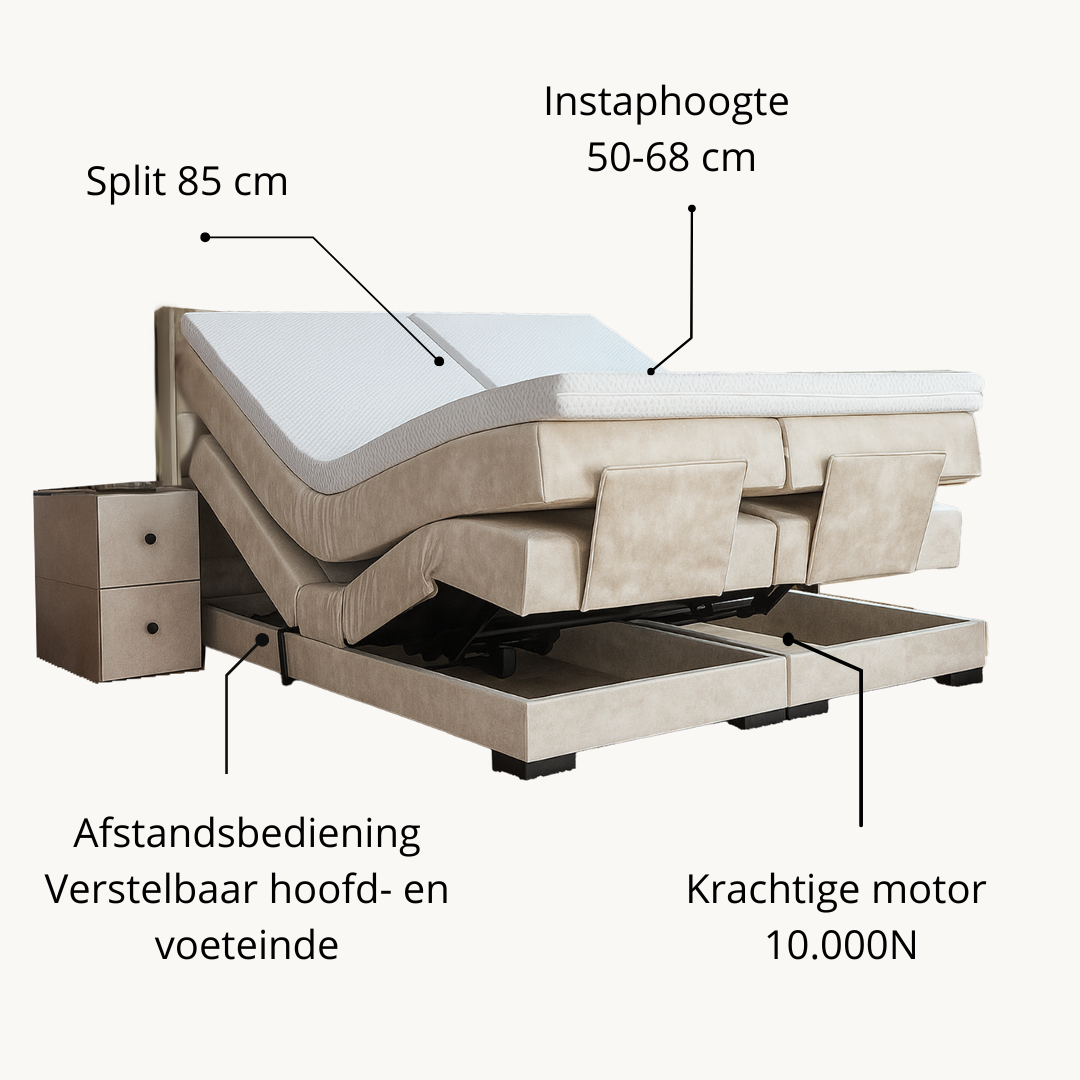 Het elektrisch verstelbare onderstel biedt volledige bewegingsvrijheid. Met een eenvoudige druk op de knop verstel je hoofdeinde, voeteneinde en de totale hoogte, perfect afgestemd op jouw wensen. De krachtige, fluisterstille motoren zorgen voor een soepele en geruisloze werking.