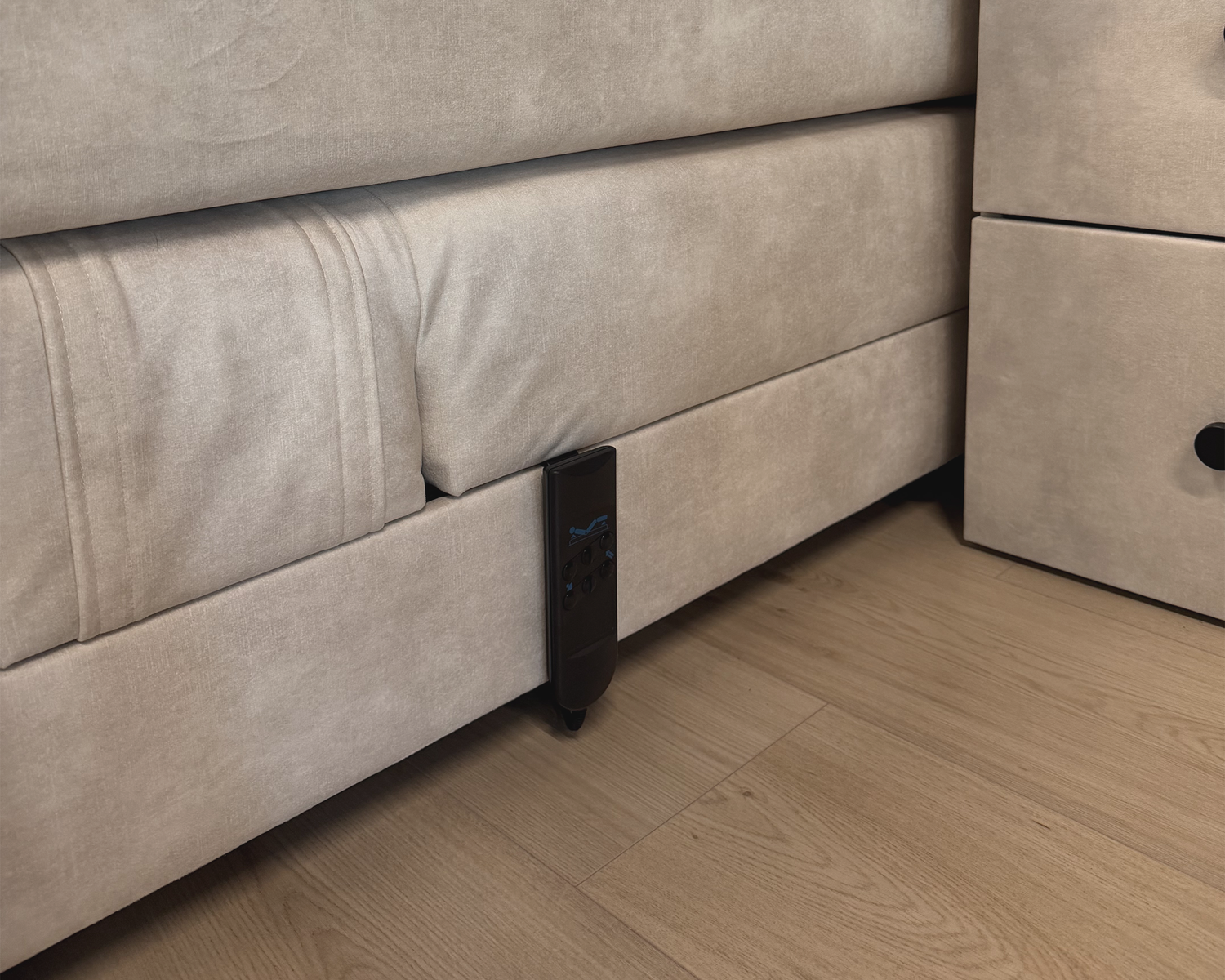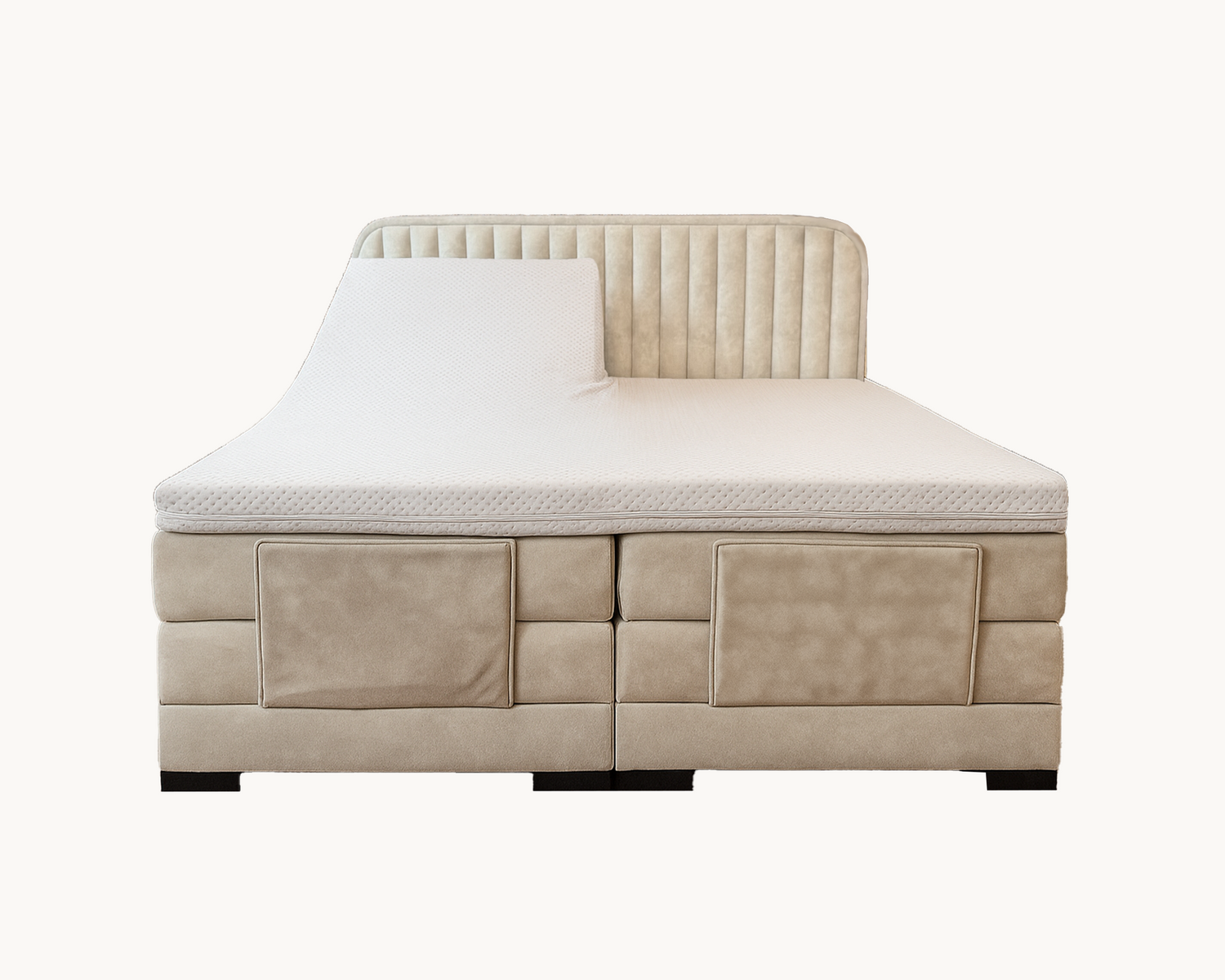 Het onderstel is slim ontworpen met een meegestoffeerde plint die de motoren subtiel verbergt voor een strakke, luxe afwerking. Daarnaast houdt de beklede voetbeugel de matrassen stevig op hun plek, zodat je ongestoord kunt genieten van een perfecte nachtrust.