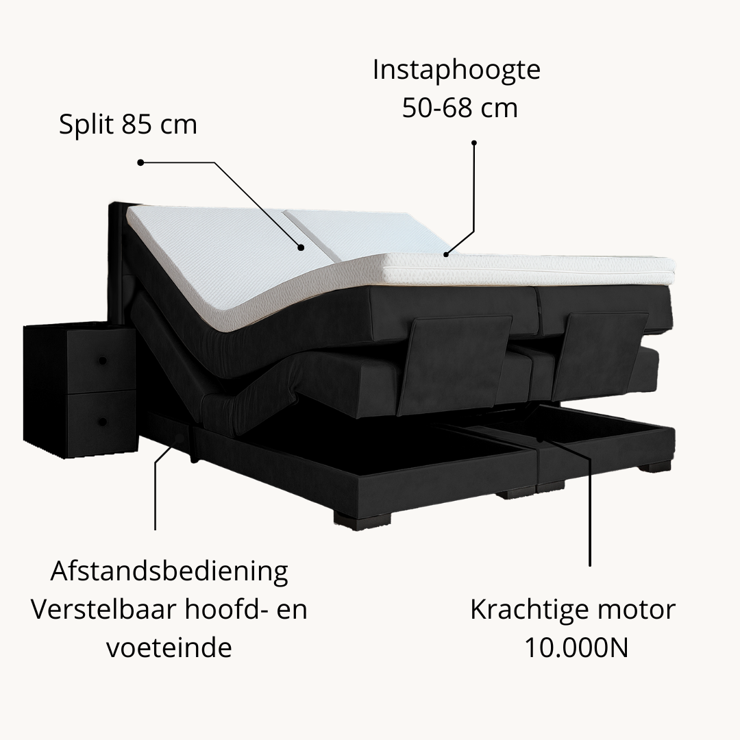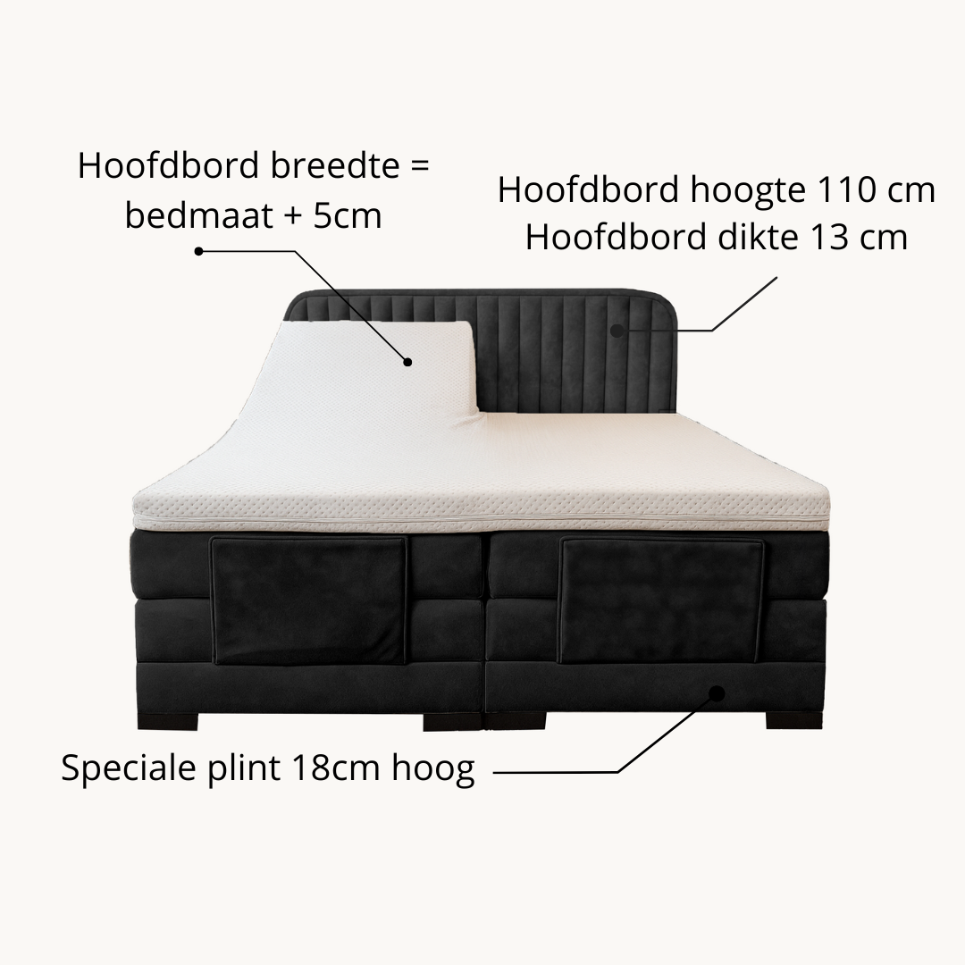 Het handgemaakte hoofdbord, bekleed met hoogwaardig velvet, geeft je slaapkamer een elegante uitstraling. De meegestoffeerde plint verbergt de motor voor een strak design, terwijl de beklede voetbeugel ervoor zorgt dat de matrassen perfect op hun plek blijven.