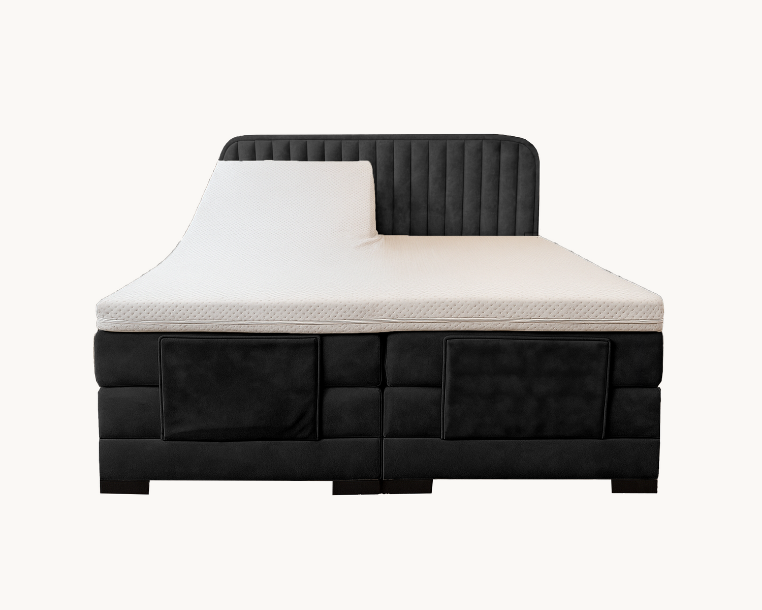 Het onderstel is slim ontworpen met een meegestoffeerde plint die de motoren subtiel verbergt voor een strakke, luxe afwerking. Daarnaast houdt de beklede voetbeugel de matrassen stevig op hun plek, zodat je ongestoord kunt genieten van een perfecte nachtrust.