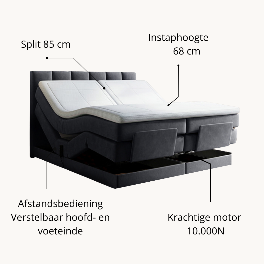 Het handgemaakte hoofdbord, bekleed met hoogwaardig velvet, geeft je slaapkamer een elegante uitstraling. De meegestoffeerde plint verbergt de motor voor een strak design, terwijl de beklede voetbeugel ervoor zorgt dat de matrassen perfect op hun plek blijven.